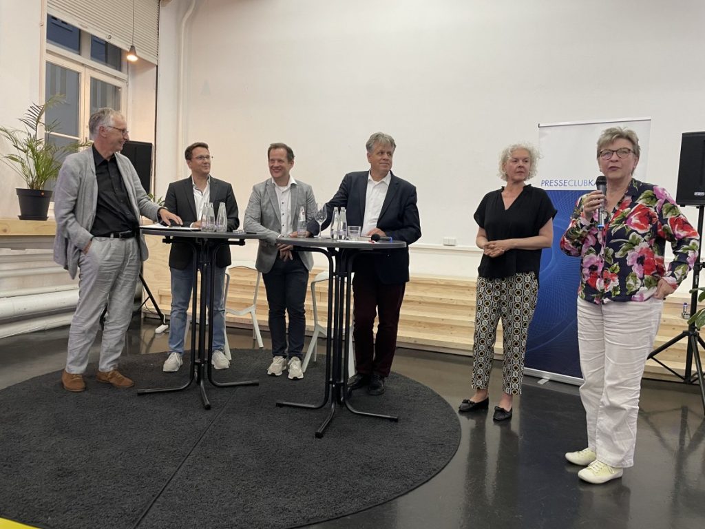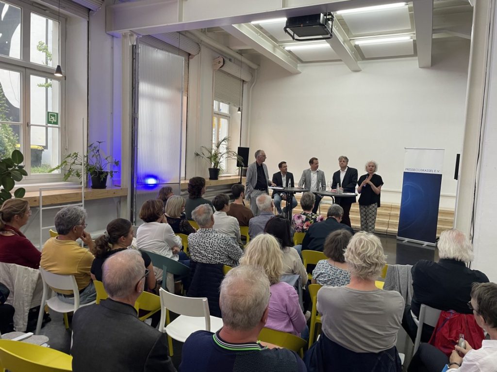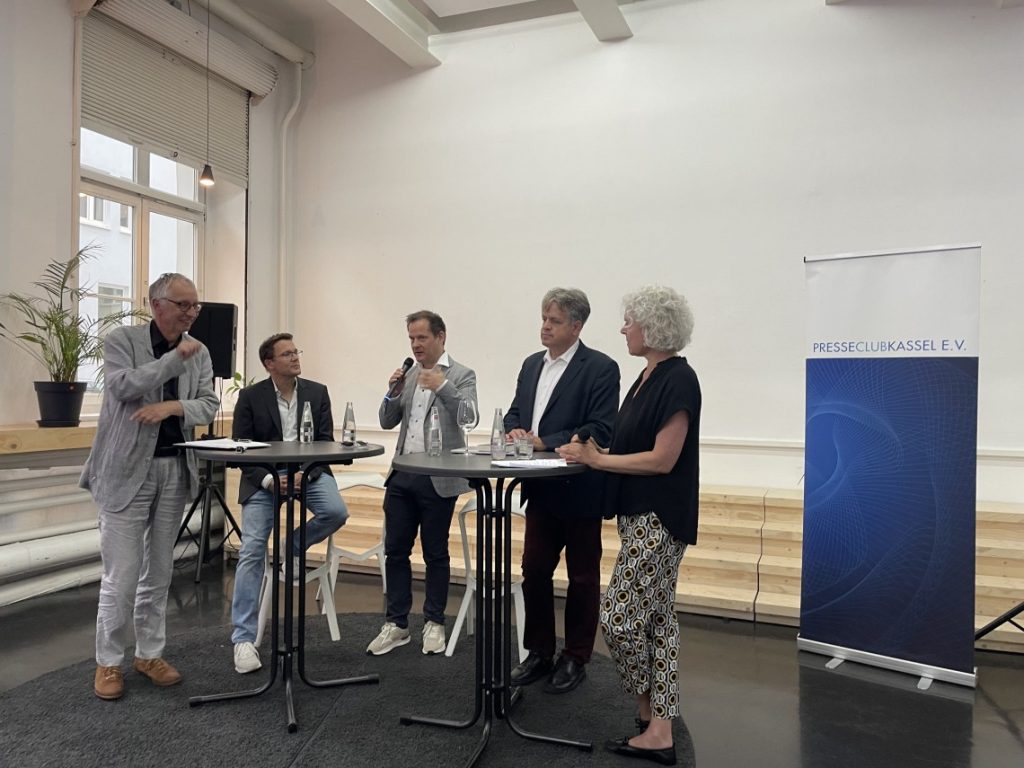 Ein hochkarätig besetztes Podium hat der Presseclub Kassel am 22. August in der Neuen Denkerei präsentiert. Zu Gast waren Jan-Peter Bartels vom ARD-Hauptstadtstudio, Marcus Bensmann von CORRECTIV und Mika Beuster, der Bundesvorsitzenden des Deutschen Journalistenverbandes DJV. Mit Blick auf die bevorstehenden Landtagswahlen am 1. September in Sachsen und Thüringen sowie drei Wochen später in Brandenburg ging es unter der Frage „Einladen oder nicht?“ um den Umgang der Medien mit Vertreterinnen und Vertretern aus Parteien mit extremen und/oder populistischen Positionen.