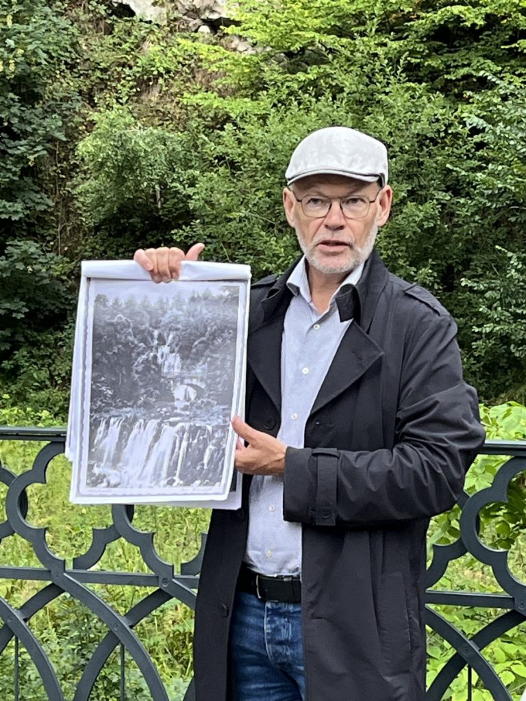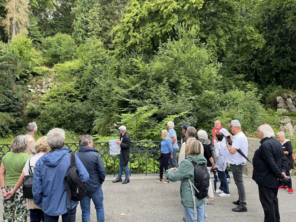 Ziehen die dunklen Wolken vorbei, oder werden wir gleich alle durchnässt? Das war auch diesmal die bange Frage, als unsere etwa 20-köpfige Gruppe Dr. Siegfried Hoss folgte, der bei Hessen Kassel Heritage für die Gärten und Gartendenkmalpflege verantwortlich ist. Wir erfuhren Spannendes über die wechselvolle Geschichte des Parks, der Wasserkunst und auch über den „Neuen Wasserfall“.